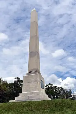 To celebrate the centennial of the Sullivan expedition, a monument was erected in what is now Newtown Battlefield State Park in 1879. One of the speakers at the dedication ceremony was General William Tecumseh Sherman, famous for his March to the Sea during the American Civil War. In his speech, Sherman justified Sullivan's "scorched earth" campaign and the displacement of Indigenous people by appealing to the widespread American 19th-century belief in manifest destiny.[50] He told his audience, "Wherever men raise up their hands to oppose this great advancing tide of civilization, they must be swept aside, peaceably if possible, forcibly if we must.[51] The monument collapsed during a storm in 1911 and was replaced with the current monument the following year.[50]