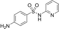 Sulfapyridine (INN; also known as sulphapyridine) is a sulfanilamide antibacterial medication. At one time, it was commonly referred to as M&B 693. Sulfapyridine is no longer prescribed for treatment of infections in humans. However, it may be used to treat linear IgA disease and has use in veterinary medicine.[1] It is a good antibacterial drug, but its water solubility is very pH dependent. Thus there is a risk of crystallization within the bladder or urethra, which could lead to pain or blockage. As with other sulfonamides, there is a significant risk of agranulocytosis, and this, rather than the development of resistance by bacteria, is the main reason for its decline in use.