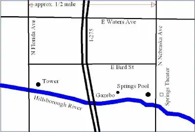 2002 saw a bid by a large chain drugstore to build on the site, but public outcry killed the project. The site was subsequently purchased by the City of Tampa who in 2005 installed lights for nighttime illumination. In what is now called River Tower Park, there is a limited one-lane access road off Bird Street, no facilities and a small parking lot. The planned River Walkway decking has been completed and now connects River Tower park to Sulphur Springs park under Interstate highway 275.