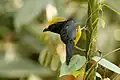 The male has the forehead and crown with the crest brilliant yellow (except glossy black in one subspecies); the whole upper plumage, sides of the head and neck, chin, throat, and breast-deep black glossed with green, the edges of the feathers of the upper plumage with a metallic lustre, and the outermost tail-feathers tipped with white; lower plumage from the breast downwards deep yellow, the thighs barred or mottled with white.[6] The recumbent crest is raised when the bird is alert or alarmed.[7]