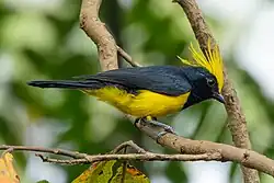 The sultan tit (Melanochlora sultanea) is an Asian forest bird with black upperparts plumage and yellow underparts, dark bill, and (depending on subspecies) a yellow or black crest. The sexes are similar, though the female has slightly duller plumage with greenish-black upperparts and throat. The young bird is duller than the adult and has a shorter crest. It is the only member of the monotypic genus Melanochlora, which is fairly distinct from other tits, third-basal in the family Paridae after Cephalopyrus and Sylviparus.[5]