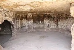 Sumatar is also described as, "the seat of the governors of 'Arab," who derived their authority from Sin.[6] Five of the Syriac inscriptions at Sumatar Harabesi refer to "the 'Arab", only one of which has been dated (circa 165 CE).[7] Jan Rëtso writes that these inscriptions confirm the presence of Arabs in the area around Edessa, as mentioned twice in the writings of Pliny the Elder.[7] The governors of the 'Arab were thought to be members of the Edessene royal family, or closely related to them, appointed by Sin to look after the "blessed mountain" that served as his sanctuary. There, these religio-political officials had altars and baetyls erected in the god's honour. A large cave at Sumatar, known as Pognon's cave, is decorated with a horned pillar, Sin's symbol.[6]