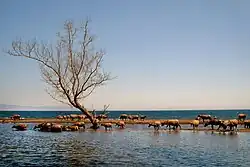 Sumbawa has an area of 15,448 square kilometres or 5,965 square miles[1] (three times the size of Lombok) with a population (at the 2020 Census) of 1,561,461;[3] the official estimate as at mid-2024 was 1,669,787.[4] It marks the boundary between the islands to the west, which were influenced by religion and culture spreading from India, and the region to the east which was less influenced. In particular, this applies to both Hinduism and Islam. While the name "Sumbawa" is used by outsiders for the whole island, locally the term is only applied to the western half (Sumbawa and West Sumbawa Regencies), while the eastern half is referred to by inhabitants as "Bima" (meaning the city as well as Bima and Dompu Regencies), as the two parts of the island are divided by geography, culture and language.[5]