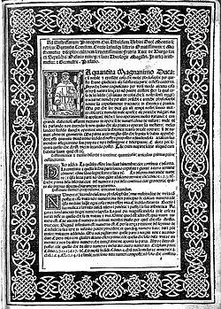 Summa de arithmetica was composed over a period of decades through Pacioli's work as a professor of mathematics, and was probably intended as a textbook and reference work for students of mathematics and business, especially among the mercantile middle class of northern Italy.[1] It was written in vernacular Italian (rather than Latin), reflecting its target audience and its purpose as a teaching text. The work was dedicated to Guidobaldo da Montefeltro, Duke of Urbino, a patron of the arts whom Pacioli had met in Rome some years earlier.[4]