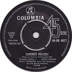 "Summer Holiday" is a song recorded by Cliff Richard and the Shadows, written by rhythm guitarist Bruce Welch and drummer Brian Bennett.[1] It is taken from the film of the same name,[1] and was released as the second single from the film in February 1963. It went to number one in the UK Singles Chart for a total of two weeks.[2] After that, the Shadows' instrumental "Foot Tapper"—also from the same film—took over the top spot for one week, before "Summer Holiday" returned to the top spot for one further week.[3] The track is one of Richard's best known titles and it remains a staple of his live shows. It was one of six hits Richard performed at his spontaneous gig at the 1996 Wimbledon Championships when rain stopped the tennis.