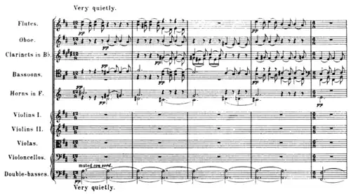 The piece is scored for two flutes, one oboe, two clarinets in B♭, two bassoons, two horns in F and strings.[6] It opens pianissimo in G major in 12