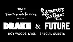 The Summer Sixteen Tour was a co-headlining concert tour by Canadian rapper Drake and American rapper Future.[2] It began on July 20, 2016 in Austin, Texas, and concluded with its final show in Toronto, Ontario, on October 8, 2016. With 60 performances across North America, the tour was produced by Apple Music to promote Drake's fourth studio album, Views (2016), Future's fourth studio album Evol (2016), as well as their collaborative mixtape, What a Time to Be Alive (2015). Guest appearances and support acts on the tour's various stops included 2 Chainz, ASAP Ferg, Bun B, Cam'Ron, DJ Khaled, Fat Joe, French Montana, Gucci Mane, Ice Cube, Kanye West, Kash Doll, Rihanna, T.I., Too Short, Ty Dolla $ign, Usher, and Young Thug, among others.[3] The tour earned a gross total of $84.3 million off of 54 shows, making it the highest-grossing hip-hop tour of all time,[4] until Drake broke this record with his own co-headlining Aubrey & the Three Migos Tour in 2018.[5]
