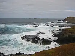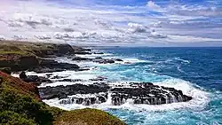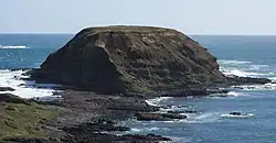 The Summerland Peninsula is approximately 360 ha (890 acres) in area and is an exposed coastal plateau surrounded by coastlines of sandy and basalt boulder beaches and rock platforms among rocky basalt cliffs.[6] Other major landforms include a coastal dune system and wetlands, made up of a freshwater lagoon, Swan Lake, and swamp, Green Lake.[7][9] The north coast of the peninsula faces into the calm waters of Western Port Bay and the south coast into the more turbid waters of Bass Strait. The area includes the offshore rock formations of the Nobbies, three small islands, and Seal Rocks (Seal Rock and Black Rock) two rocky islets of 8 hectares, about 1.5 km off the western tip of the peninsula in Bass Strait.[10]