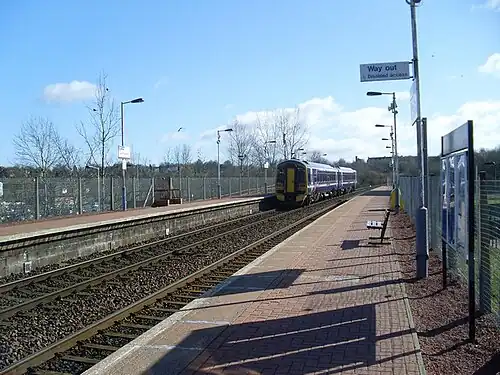 The original Summerston station (closed in 1951)[1] was located about 1+1⁄2 miles (2.5 km) to the north of the present station on the defunct and dismantled Kelvin Valley Railway line between Maryhill and Kilsyth; the current one is one of five built for the Maryhill Line project by British Rail in 1993.