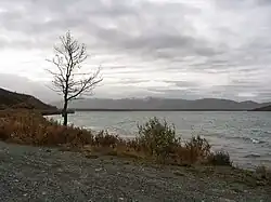 It is glacier-fed by several creeks to the north, including Gunn Creek (which flows from the Gulkana Glacier).[1]: 13 There are also additional creeks that feed into the lake from the west and southeast. The lake is up to 300 feet (91 m) deep and is covered with ice up to 5 feet (1.5 m) thick from November until mid-June. It is also the headwaters of the Gulkana River (a main tributary of the Copper River)[1]: 2 well known for its "Copper River Reds" salmon, which migrate in late September to spawn in Gunn Creek on the north end of the lake. The lake is 7.1 miles (11.4 km) long, 1.1 miles (1.8 km) wide, and has a surface area of 6.28 square miles (16.3 km2).[1]: 5 & 7 [2]