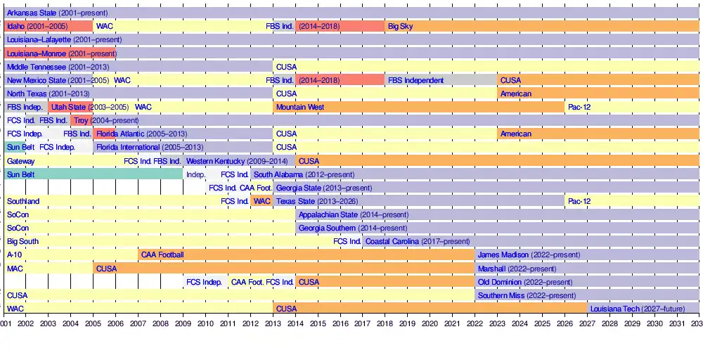 Texas State will leave the Sun Belt in 2026 and will be replaced in the West Division by the Louisiana Tech Bulldogs by the 2027 season.[4]