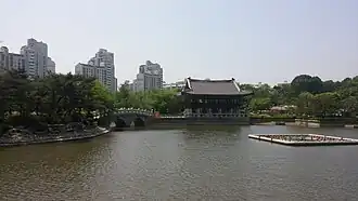 - Seongnam Central Park (성남중앙공원; 城南中央公園), also known as Bundang Central Park, located at the foot of Mt. Yeongjangsan [ko] (영장산; 靈長山) which is 413.5m high. It boasts four badminton courts, a croquet course, an outdoor theatre, a water mill, and Bundang Pond (분당호; 盆唐湖), which is equipped with several fountains.[10]