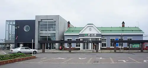 Sunagawa Station (砂川駅 Sunagawa eki) is a railway station on the Hakodate Main Line of Hokkaido Railway Company, located in Sunagawa, Hokkaidō, Japan, opened in 1891.[1][2] The station previously served the closed Utashinai Line and Kamisunagawa Branch Line.