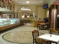 When the Suncoast opened in 2000, it planned to attract customers primarily through its various restaurants,[19] which included the St. Tropez buffet[48] and an oyster bar.[19] The resort's signature restaurant was Primo's, an upscale steakhouse located on the second floor.[19][49] Primo's included seating for 140 people, and provided views of the city through tall windows that were visible by all customers.[49] The resort also featured Via Veneto, an Italian restaurant designed around a large mural made of Tiffany-style stained glass. The mural, which included a character bearing an intentional resemblance to Gaughan, had initially been created for the Barbary Coast Hotel and Casino's opening in 1979. Señor Miguel's, a Mexican restaurant at the Suncoast that was named after Gaughan,[19] received a "B−" rating from the Las Vegas Review-Journal.[50]