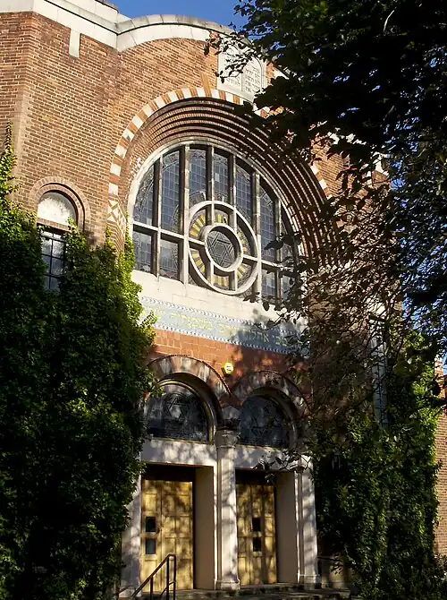 Architectural historian Sharman Kadish described the synagogue's colourful design as a blend of Byzantine Revival and "cinematic art deco style."[5] The exterior is an Art Deco interpretation of Byzantine style, with an oversized, arched entrance, paired arched doorways, polychrome brickwork and basket capitals.[9] Kadish described the interior as "spanned by a deep barrel vault over the central aisle, which was originally painted to imitate a star-spangled sky. The gallery runs around three sides carried on slender iron columns with palmette capitals. The plasterwork Ark canopy is highly decorative, painted and gilded. It is classical in form but features decoration of Islamic and Byzantine origin, especially the cushion capitals to the columns and the chevron patterns on the shafts ..."[5]