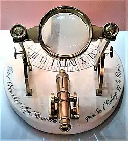 The gun and the linear ignition groove of the fuse were aligned on a north–south axis, parallel to that of the sundial, while the lens concentrated the sun rays on the fuse when the sun was directly above. Subsequently, the burning fuse ignited the powder placed in the barrel of the cannon. The lens was mounted on an adjustable frame, which enabled its position to be changed depending on the season.[2][3] During winter, in December for example, for the small brass cannon manufactured by Rousseau of Paris, the lens had to be lowered by four inches, compared to its position in June as the position of the sun in the sky is lower in winter than during the summer.[3]