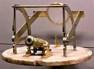 A sundial cannon, sundial gun, noon cannon or meridian cannon,[1] also noonday gun is a device consisting of a sundial incorporating a cannon with a fuse that is lit by an overhanging lens, concentrating the rays of the sun, and causing the cannon to fire at noon, when properly oriented along a north–south axis.[2][3] The cannon sizes ranged from large to small depending on the location of their use. The household variety was used in estates to signal the time for the midday meal.[4] Larger sizes were used in European parks to signal noon.[2][3][4]