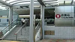 Sunny Bay (Chinese: 欣澳; Cantonese Yale: Yān ou) is an MTR station in Yam O. It is between Tung Chung and Tsing Yi stations. The station is an interchange station between the Tung Chung line and the Disneyland Resort line to Hong Kong Disneyland. The station was originally to be named Yam O (); however, the name was ultimately replaced, likely because of its linguistically negative connotations[footnote 1].Services to the station commenced on 1 June 2005. The transfer facilities to the Disneyland Resort line opened 2 months later (1 August 2005) that year. The livery of the station is slate grey.