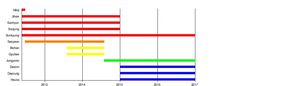 | Past members | Jeon Minji Zhang Bichen Lee Gyuhee Hwang Jihee Kim Soohyun Cho Seoyeon Jung SooJung Lee Sunkyung Heo Jung Yoon Hong Heuira Da Young Da Som |