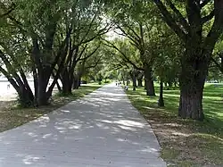 Sunnyside is a lakefront district in Toronto, Ontario, Canada. It includes a beach and park area along Lake Ontario's Humber Bay, from west of Exhibition Place to the mouth of the Humber River. The area has several recreation uses, including rowing clubs, sports clubs, picnic areas, playgrounds, a nightclub, a bathing pavilion and public pool. The area is a 3 kilometres (1.9 mi) long strip along the lakeshore, bounded by the Gardiner Expressway and rail lines, which separate it from the Parkdale, Roncesvalles and Swansea neighbourhoods to the north. The name originates in a local farm owned by John Howard, which was situated just to the north, on the location of the current St. Joseph's Health Centre hospital.