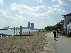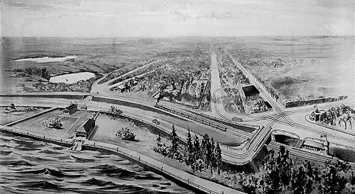 By this time very little lands were left along the waterfront, and the lands were used for buildings on piers, rail lines, road ways, hydro towers and temporary changing booths for bathers. The general sentiment was that the lakeshore was in a dismal state. Thomas Joseph Stewart, a federal MP in 1913, remarked that Sunnyside was a "dirty, filthy hole."[7] In 1914, the Toronto Harbour Commission started a CA$25 million ($427 million in 2023 dollars)[8] project to improve the waterfront from Ashbridge's Bay in the east, to the Humber in the west.[9] Following this plan, most of the 1910s and early 1920s was spent on construction and most of the waterfront lands were little used. All of the buildings on the water west of Roncesvalles were demolished. The Commission extended the shoreline about 100 yards (91 m) to the south, from Wilson Park Road to the Humber River (the western boundary of Toronto at the time), using landfill brought from Pickering, Ontario and sand dredged from the lake bottom. The hydro-electric lines and the Canoe Club building, previously located on the water, were now inland.