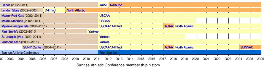 - 2011 – The Sunrise would cease operations as an athletic conference after the 2010–11 academic year; as many schools left to join their respective new home primary conferences, beginning the 2011–12 academic year: Fisher to join the American Mideast Conference, while the rest would leave the NAIA and join the USCAA: St. Joseph, Vermont Tech (now Vermont State–Lyndon), Maine–Machias to join the YSCC; and Maine–Fort Kent, Maine–Presque Isle and SUNY Canton to join as USCAA Independents (the latter two are either accepted or in the process into transition from the NAIA to NCAA Division III).