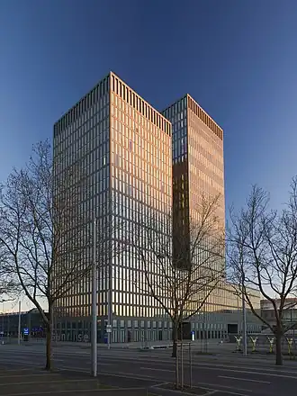 The Sunrise Tower (German: Sonnenaufgangsturm) also known as Hochhaus Hagenholzstrasse is a high-rise office building in Zürich, Switzerland. Built between 2000 and 2004, the composition consists of two cojoined towers standing at 90 m (300 ft) respectively 72.5 m (238 ft), with the taller half being divided into 26 floors. They share the position of the 15th tallest buildings in Switzerland.[2]