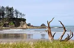 Sunset Bay is home to one of Oregon's ghost forests, created by an earthquake on the Cascadia subduction zone that dropped the shoreline about 1,200 years ago. The shoreline contains stumps of drowned spruce trees.
