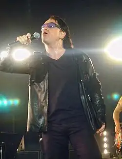 The on-field audience held light sticks.[48] The show began with U2 performing their 2000 hit single "Beautiful Day". For the first verse, Bono walked with a cameraman through the on-field crowd to reach the stage. While doing so, fans started slapping Bono on the back. Realising the wires for his in-ear monitors were exposed, he began to panic. He said: "All one person has to do is pull the wire, and I'm off air. I would hear nothing. Off the air in front of a billion people!" Bono said that his smirking facial reaction was a reflection of his fear at that moment;[49] he admitted that he was "swaggering with the most annoying smirk ever seen. You just think: That guy is such a prat!"[50]