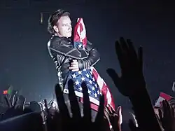 The band's second song was the elegiac "MLK", during which the scrim was raised behind the stage, onto which a scrolling list of names of the 9/11 victims were projected.[51] This segment segued into the third and final song, the band's 1987 hit single "Where the Streets Have No Name". Towards the end of the song, the scrim was released to the ground, and the names continued to scroll across the interior of the Superdome.[17] Terry Price of the Hartford Courant said it was "eerily reminiscent of the World Trade Center collapses".[52] At the conclusion of the song, Bono opened his leather jacket to reveal an American flag in the lining.[53]