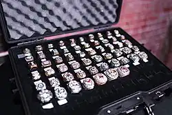 These rings are typically made of yellow or rose gold with diamonds. They usually include the team name, team logo, the phrase, "World Champions,", and the Super Bowl number (usually indicated in Roman numerals). Many rings feature diamonds in the shape of the Vince Lombardi Trophy or a football, to illustrate the number of Super Bowls that the franchise has won.[7] Also, the rings are customized with the player's name and uniform number. The NFL contributes approximately $5,000-$7,000 per ring for up to 150 rings for the winning team; any additional costs are borne by the team.[8] Most rings are manufactured by memorabilia company Jostens.[9][10] The rings are normally presented in an elegant box and/or display case.