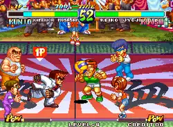 The rules of the game are similar to that of the original arcade version of Super Dodge Ball. Two teams battle each other out, with each team restricted to their side of the court, attacking each other with a ball, until all the members of one team are all eliminated. This time, teams are composed of only three members: a captain and two teammates. When a character's vitality gauge runs out completely, instead of being eliminated completely from the match, they are moved to the opposing team's outfield, where they can still assist their remaining teammates by attacking them from within the opposing side of the court. The Power Shots in the game are now performed by inputting fighting game-style commands. The captains in each team have two Power Shots, a Counter Shot, a Special Pass, and a Super Power Shot that can only be performed when the team's power gauge is completely filled. The generic teammates only have one power shot each.
