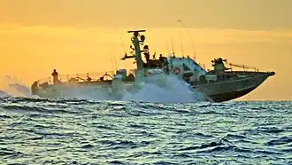 The Super Dvora Mark III-class patrol boat is the latest generation of the Dvora family of fast patrol boats or fast attack craft (FPB/FAC). Manufactured by IAI Ramta in 2004[1] these vessels are capable of travelling up to 50 knots (93 km/h; 58 mph) in littoral waters thanks to its state of the art thrust vectoring control Articulated Surface Drives (ASD) while holding various armaments, from automatic grenade launchers, AGM-114 Hellfire missiles, SPIKE NLOS missiles, and 30 mm cannons in its armory.[3][4][5][6]