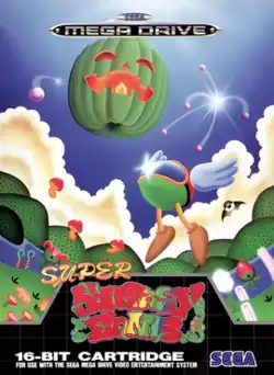 Super Fantasy Zone (スーパーファンタジーゾーン, Sūpā Fantajī Zōn) is a 1992 scrolling shooter video game developed and published by Sunsoft for the Mega Drive. Part of Sega's Fantasy Zone series, it was released only in Japan and Europe. Players control the character Opa-Opa on his quest to defeat Dark Menon, and the game plays similarly to previous Fantasy Zone entries. The game plays similarly to Defender, where the screen scrolls in the direction that Opa-Opa is going. The player shoots at enemies to defeat them, collecting gold coins that are used to purchase temporary upgrades that improve Opa-Opa's offensive capabilities and speed, among other things.