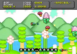 The player can upgrade Opa-Opa's weapon loadout by collecting gold coins dropped by destroyed enemies, with varying amount of gold dropped depending on the enemy. These upgrades can be used to change various aspects of Opa-Opa, including his speed, offensive capabilities, and ability to light the area.[4][3] Different weapons can be used, including one with a wide spread shot, one that shoots behind Opa-Opa, one that shoots a laser, and more. These upgrades eventually run out, regardless of whether they are used or not.[3] The game allows players to use a rapid fire option to fight enemies.[5] The game features a reference to the shooter Space Harrier, including a code that replaces the music with Space Harrier music.[5]