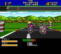 Super Mad Champ[a] is a racing and vehicular combat video game developed by Givro Corporation and published by Tsukuda Original in Japan exclusively for the Super Famicom on 4 March 1995.[1] The game is centered around a series of motorcycle races throughout various locations that the player must win to advance to higher-difficulty races, while using attacks to hinder the other racers.