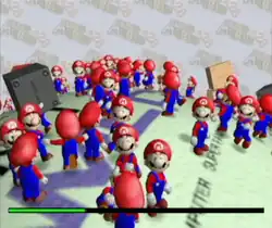 The name Super Mario 128 gained permanent fame when reused for a new technology demonstration at the Space World event on August 24–26, 2000.[10] This software was controlled by staff to show new gameplay mechanics and the processing power of the upcoming GameCube game console.[11] Development of the demo was directed by Yoshiaki Koizumi, who would later become the director of Super Mario Galaxy.[9] In the demo, a large 2D Mario spawned increasing numbers of smaller Mario figures, independently walking across a circular board, until the number of onscreen characters reached 128. The terrain in the demo was manipulated, rotated, and spun like a floppy saucer to show the physics engine software. GamePro declared Super Mario 128 to be one of the 15 most anticipated games of 2001. Regarding Nintendo's secrecy and lack of elaborate demonstration of the camera system, GamePro assumed that "The precautions are warranted as developer after developer aped the exact camera mechanism from Mario 64 for their titles."[12]