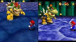 Super Mario 64 DS was developed by Nintendo Entertainment Analysis and Development and published by Nintendo for the Nintendo DS.[4] It is a remake of the Nintendo 64 launch game Super Mario 64, with the game's 3D engine mirroring many visual effects used in the original game.[5] Graphical changes include the lack of texture filtering, and updated versions of the character models which represented their newer, more detailed designs.[6][7] Coins have been upgraded from 2D animation to 3D models.[8] All of Koji Kondo's music from the original game was re-used, with Kenta Nagata providing new music for the game. The voice actors from Super Mario 64 returned as well, and Kazumi Totaka joined the cast, playing the role of Yoshi.