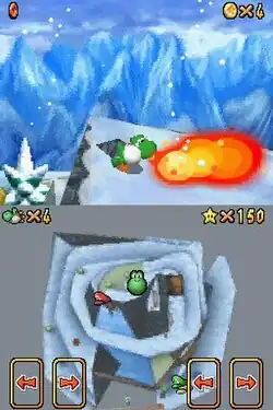 The game uses both of the system's screens to offer new options. The top screen displays the normal gameplay, while the bottom touchscreen can function as an overhead map and touch controls. The overhead map displays the current course the player traverses and displays item locations. The touch controls include virtual buttons, which rotate the top screen's camera angle, and directional character controls, which can operate with either the DS stylus or the player's thumb using the DS wrist strap.[3] In addition to the single-player adventure, the game includes 36 minigames and a multiplayer mode. Minigames are made accessible by catching rabbits in the main game. All the minigames use the touchscreen to play and are based on different themes: racing, card games, puzzles, and so forth. The multiplayer mode uses the wireless DS Download Play where up to four players compete against each other using Green, Red, Blue, and Yellow Yoshi (voiced by Kazumi Totaka)—character hats appear in the stage allowing players to transform into either Mario, Luigi, or Wario. Wario can stun opponents by picking them up, swinging them around, and throwing them.