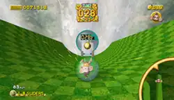 Super Monkey Ball 2 continues its predecessor's core Marble Madness-style gameplay.[4][5] The player controls a monkey running in a ball with the joystick through maze-like stages with obstacles to dodge, which have to be completed under a time limit without the monkey falling off platform ledges.[4][5] As the game progresses, there are more paths that loop, spin and corkscrew, and levels that move horizontally, vertically and 360-degrees.[5] The sequel has a more spiked difficulty curve as a result of new design choices. Looped paths occasionally have obstacles and cockscrewed paths within them and some rotating stages have pillars popping out of holes.[5] Another addition is switches scattered throughout that fast-forward, rewind, play and stop platforms while rolled over onto them, making the sequel more focused on strategy and puzzle-solving.[5][6]