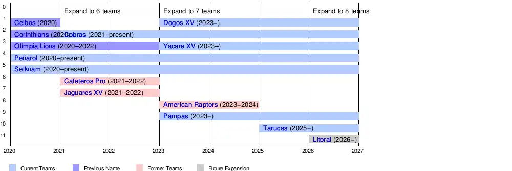 The tournament includes seven teams through franchises. The holding of this tournament in the Americas has the precedent of the extinct Superliga Americana de Rugby (SLAR) (English: American Rugby Superleague), a precursor competition.[6]