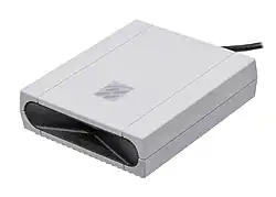 The Super Scope comes packaged with a small infrared receiver, 2.5 in × 2.5 in × 1 in (6.4 cm × 6.4 cm × 2.5 cm) in size, with a standard Super NES controller cord attached. On the front is an oval-shaped black area, receding back from the two sides to an infrared transmitter about the size of a dime. The receiver must be placed above the screen and connected to the system's second controller port for play.[3]