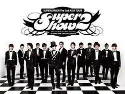 Super Show 2 is the second Asia-wide live concert tour by the South Korean boy band Super Junior, to support their third studio album, Sorry, Sorry.[1] The tour commenced with three shows in Seoul, South Korea in July 2009 and continued with one show in Hong Kong, five in China, two in Thailand, two in Taiwan, one in Malaysia and one in Philippines. A total of 15 shows in nine cities and six countries throughout Asia.[2]