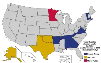 The Republican primaries and caucuses concluded with Donald Trump winning Alabama, Arkansas, Georgia, Massachusetts, Tennessee, Vermont, and Virginia; Ted Cruz winning Alaska, Oklahoma, and Texas; and Marco Rubio winning Minnesota. John Kasich and Ben Carson were also in the election, but neither won any states. Results from the North Dakota and Wyoming caucuses were yet to be determined, as their delegates were not required to support the winners of those contests and can freely pledge to their preferred candidate during their respective state party conventions.