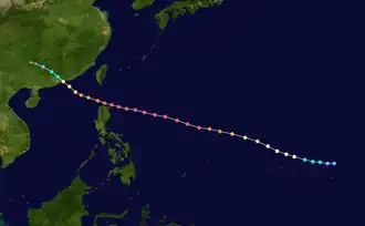 Sally strengthened further as it traversed the Philippine Sea, and at 06:00 UTC on September 7, the JTWC analyzed Sally's one-minute sustained winds to have reached 315 km/h (196 mph); surface winds as fast as 370 km/h (230 mph) were estimated by aircraft reconnaissance probing the typhoon.[4][2] The Japan Meteorological Agency (JMA) estimated that Sally's central barometric pressure decreased to 895 hPa (mbar; 26.43 inHg).[4] This made Sally the strongest typhoon of the 1964 Pacific typhoon season as measured by both wind speed (tied with Opal) and central pressure.[3] These winds were also among the fastest ever analyzed for a tropical cyclone globally.[6] The center of Sally then moved near the northern Philippines, passing 40 km (25 mi) north of Aparri on September 9.[7] The JTWC estimated that Sally's one-minute sustained winds decreased during this period, and continued to diminish further as the typhoon tracked across the South China Sea.[4] At 15:00 UTC on September 10, Sally made landfall on the People's Republic of China east of Hong Kong with one-minute sustained winds of 155 km/h (96 mph). After moving inland, the system rapidly weakened, degenerating into a tropical storm later on September 10 and losing its identity as a tropical cyclone the following day over South China.[3][2][4] The remnants of Sally continued towards South Korea and Japan before they were last noted on September 16 over southern Kamchatka.[3]