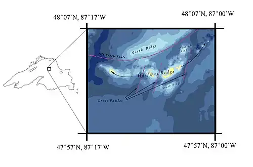 The shoal consists of four geologic ridges: the north ridge, the central ridge, the halfway ridge, and the south ridge. The north ridge is a subtle but distinct rise across the northern portion of the shoal; the central ridge consists of a few high peaks in the eastern-center of the shoal; the halfway ridge is the largest ridge and stretches in an arc from east to west across the entire feature; the south ridge is made up of two associated basalt rises on the southern edge of the formation. The Isle Royale Fault creates a gorge between the north ridge and the other three ridges.[5]