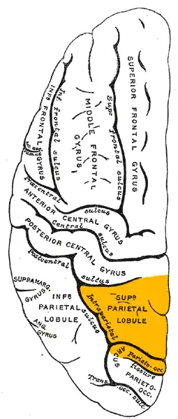 ![]() Lateral surface of left cerebral hemisphere, viewed from the side. (Superior parietal lobule is shown in orange.) | |