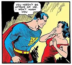 Superman/Clark Kent and Lois Lane first appeared in Action Comics #1 (June 1938). Their first story together includes a sequence in which Clark behaves in a cowardly fashion, leaving Lois to defend herself against an aggressive man, from whom Superman later saves her. From then on, Clark was established as a shy man attracted to Lois, while she was interested in his heroic alter ego, Superman. This remained the status quo in the comics for decades, though Lois did warm up to Clark for the most part; yet their relationship could not really advance with Lois left out of Clark's secret and the Clark Kent persona is a disguise.[11]
