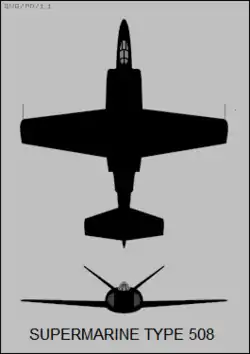 The Type 508 was the first Scimitar ancestor; it shared the broad layout of the unflown Type 505, both possessing a straight-wing paired with a V-tail and twin jet engines.[8] The redesign was done in a manner that, if desired, an undercarriage-less configuration was still viable; furthermore, it was designed in such a manner that it could be readily adapted to Royal Air Force requirements as well. The primary structural change between the two designs affected the wing spars, which were redirected underneath the engines to accommodate the undercarriage.[8] During November 1947, Supermarine received an initial order for three Type 508s to fulfil Specification N.9/47.[4]