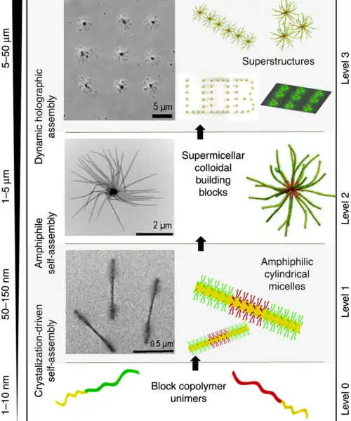 - ^ a b c Li, Xiaoyu; Gao, Yang; Boott, Charlotte E.; Winnik, Mitchell A.; Manners, Ian (2015). "Non-covalent synthesis of supermicelles with complex architectures using spatially confined hydrogen-bonding interactions". Nature Communications. 6: 8127. Bibcode:2015NatCo...6.8127L. doi:10.1038/ncomms9127. PMC 4569713. PMID 26337527.